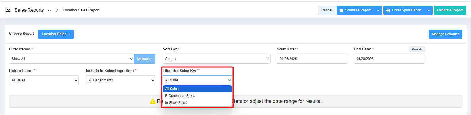 The Filter the Sales By drop-down lets you filter the report records based on three parameters: All Sales, E-Commerce Sales, and In Store Sales.