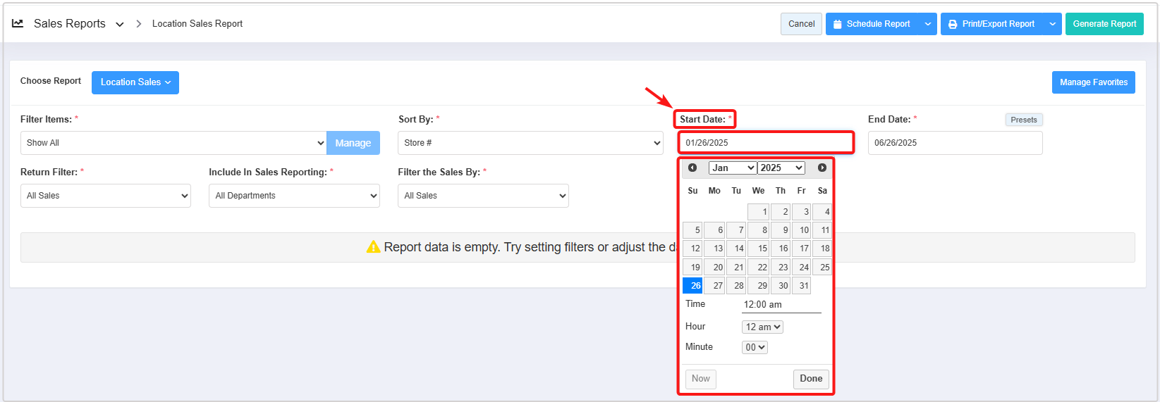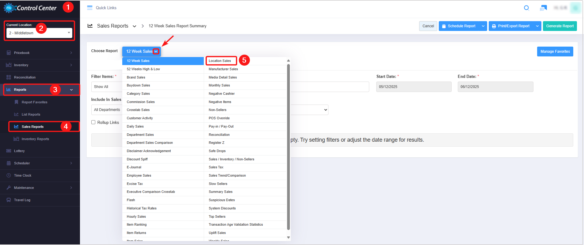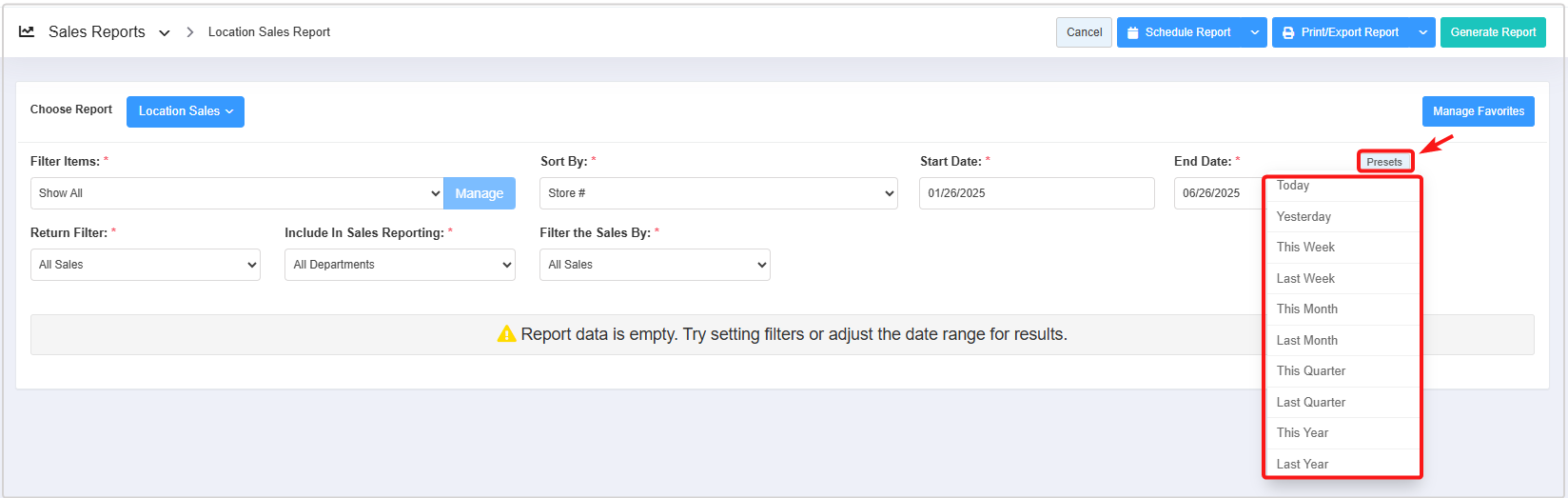 - You can view the Location Sales Report for a specific date range by selecting a date range and clicking "Generate Report."