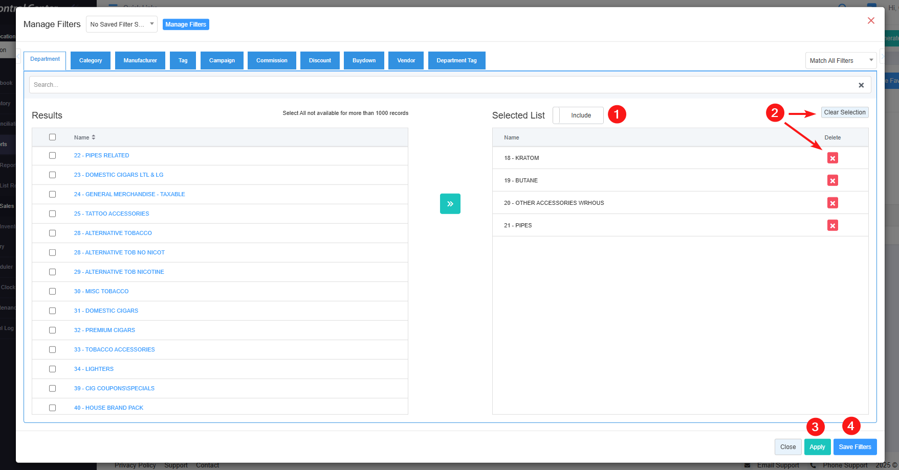 - 3: Parameter Tabs: You will see ten tabs: Department, Category, Manufacturer, Tag, Campaign, Commission, Discount, Buydown, Vendor, and Department Tag. Select the required tab, i.e., "Department," to create or apply a custom filter specific to the selected Departments.