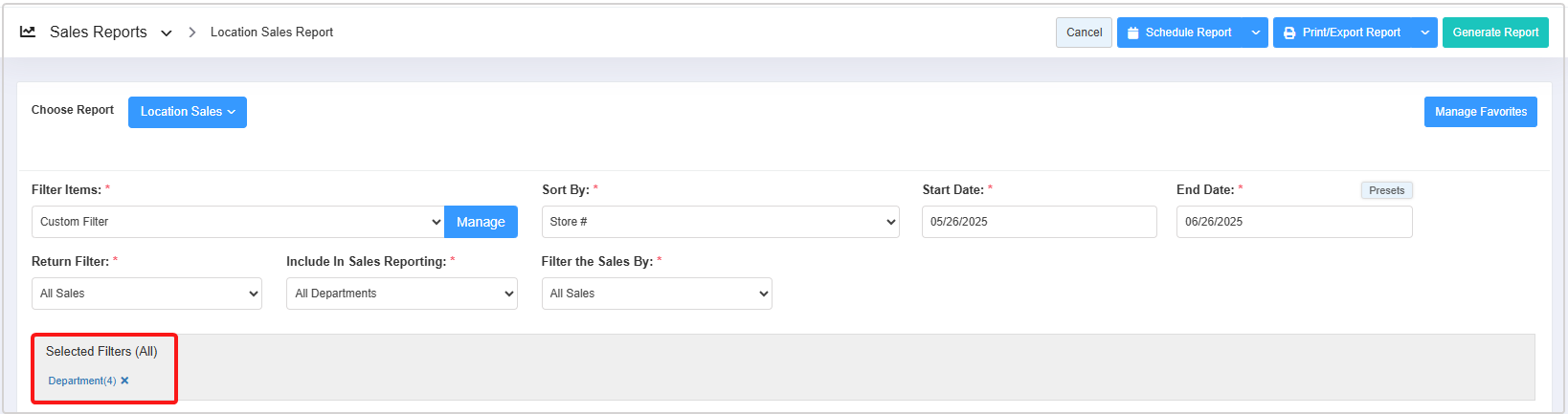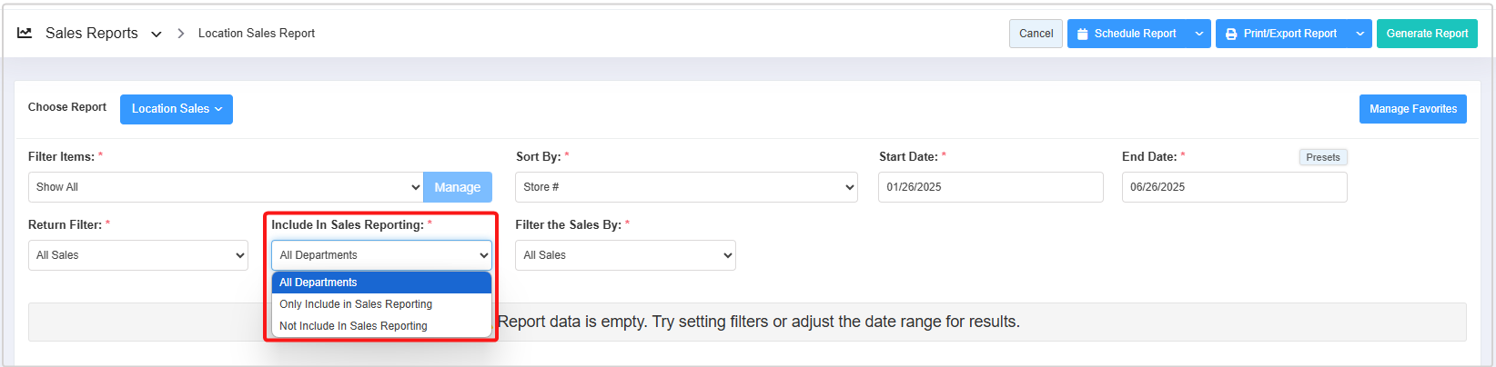 - Include in Sales Reporting: This filter lets you filter the location sales records based on three parameters: All Departments, Only Include in Sales Reporting, and Not Include In Sales Reporting. 3.5 Include In Sales Reporting explains further details.