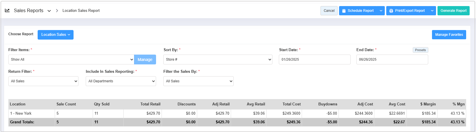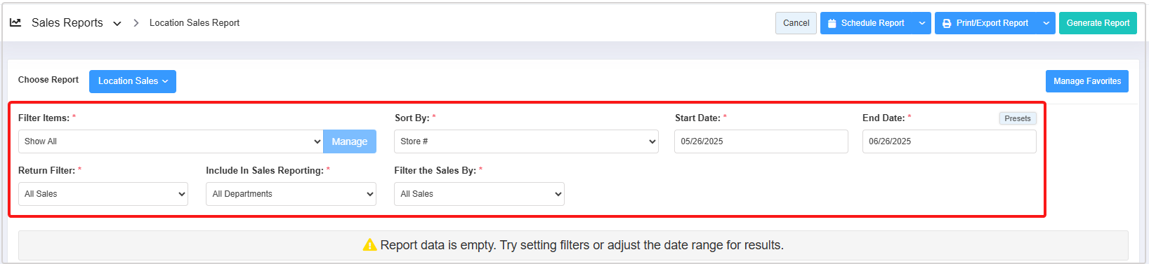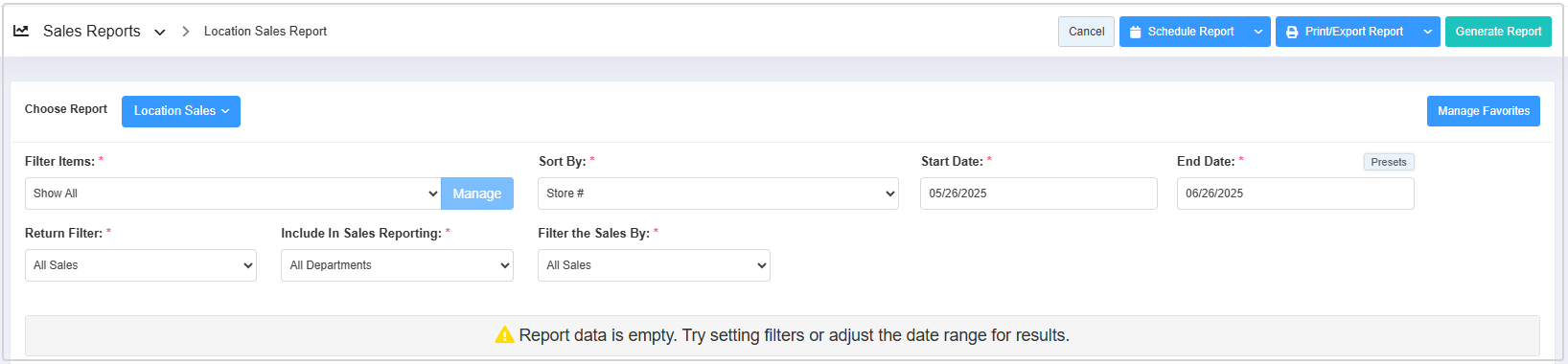 When you click "Location Sales," the Location Sales Report screen will open. As shown in Figure 1.2, it provides relevant filtering and sorting options.
