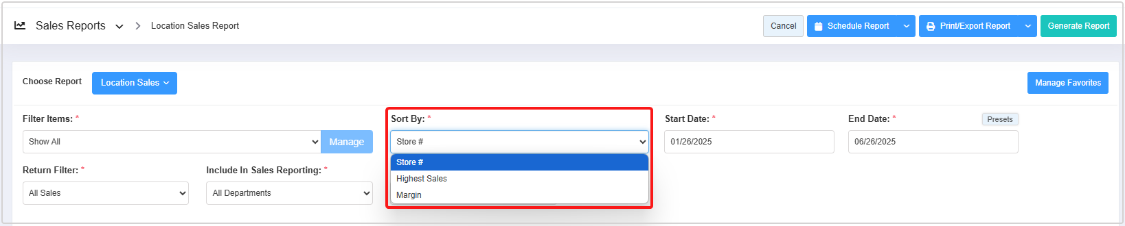 The Sort By filter is valuable for corporate employees because they can access all company locations. This filter lets them view report records according to three parameters: the ascending order of the store number, the order of total retail from highest to lowest, and the profit margin from highest to lowest by three options, "Store#," "Highest Sales," and "Margin."