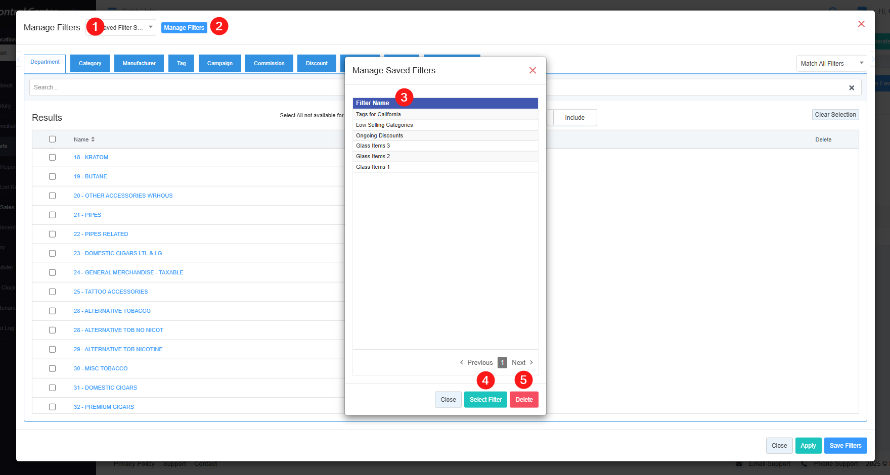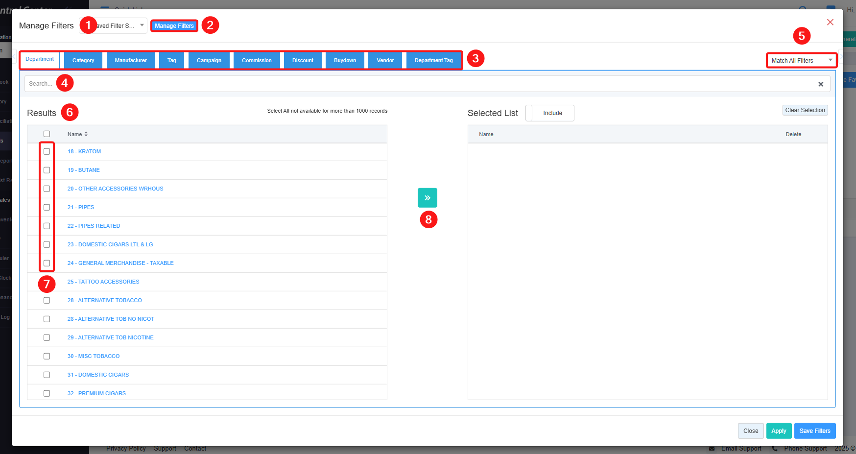 - 5: Match All Filters Drop-Down: Use the Match All Filters filter to decide whether or not the Manage Filter screen data matches all applied filters. This drop-down is useful when you use multiple parameter tabs. For example, you choose a few manufacturers from the "Manufacturer" tab and a few departments from the "Department" tab.