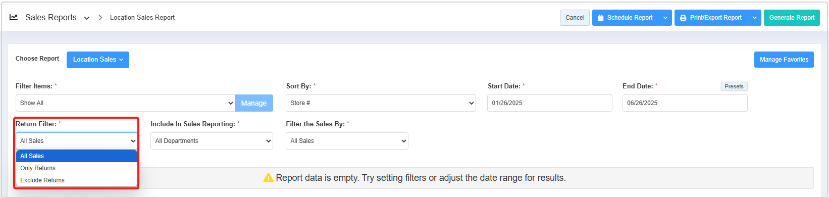 The Return Filter drop-down lets you sort the sales records by three parameters: All Sales, Only Returns, and Exclude Returns.
