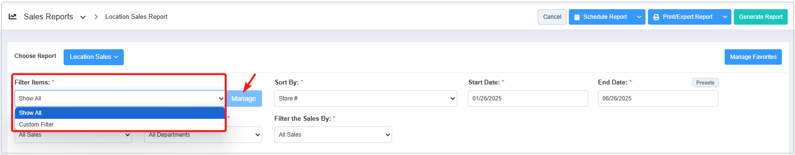 - Show All: The system selects "Show All" by default. It considers all parameters to generate the Location Sales Report for the selected locations. The "Manage" button is disabled for this option.