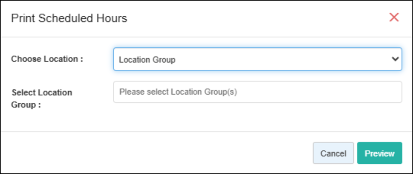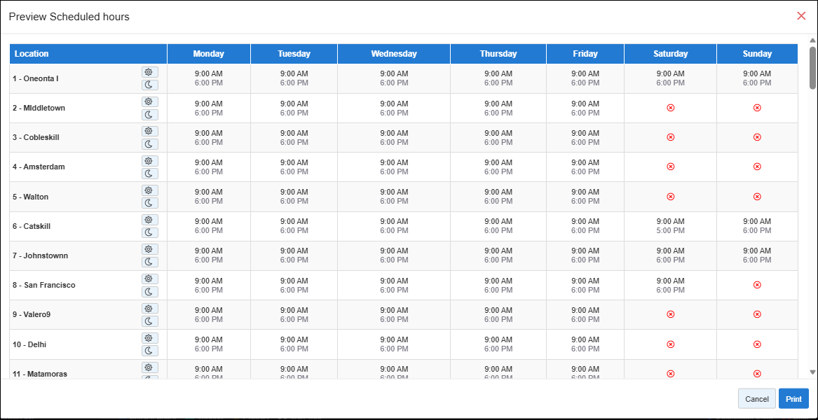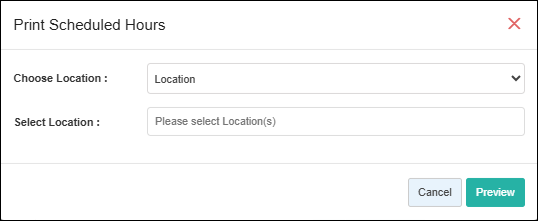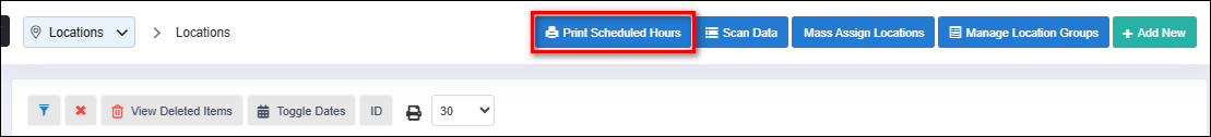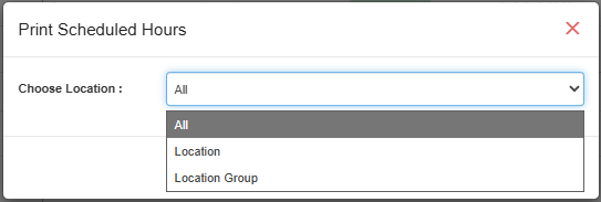 The “Print Scheduled Hours” button allows users to view and print the scheduled working hours of locations directly from the Location Listing screen. This feature supports printing for: