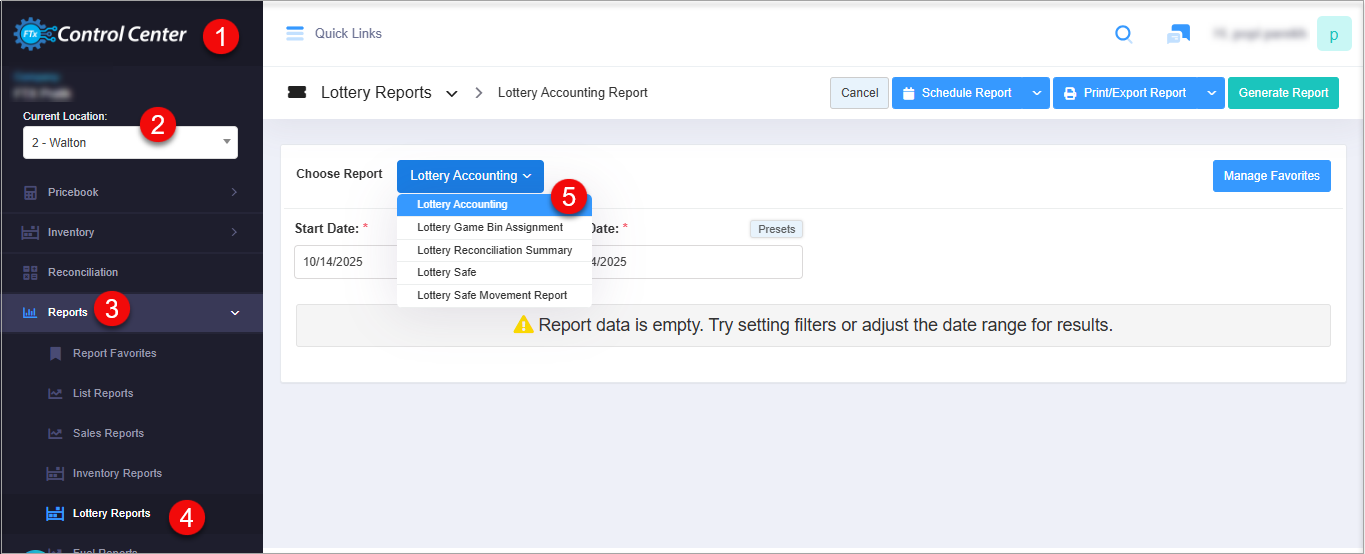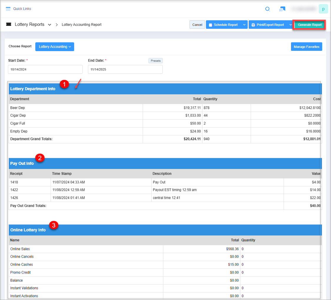- How to generate the "Lottery Accounting Report" for the selected date range