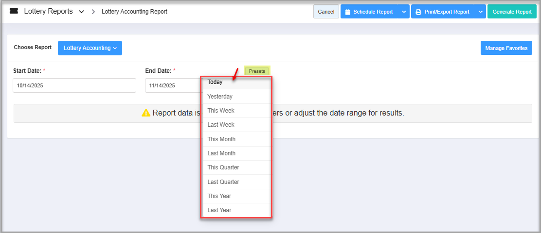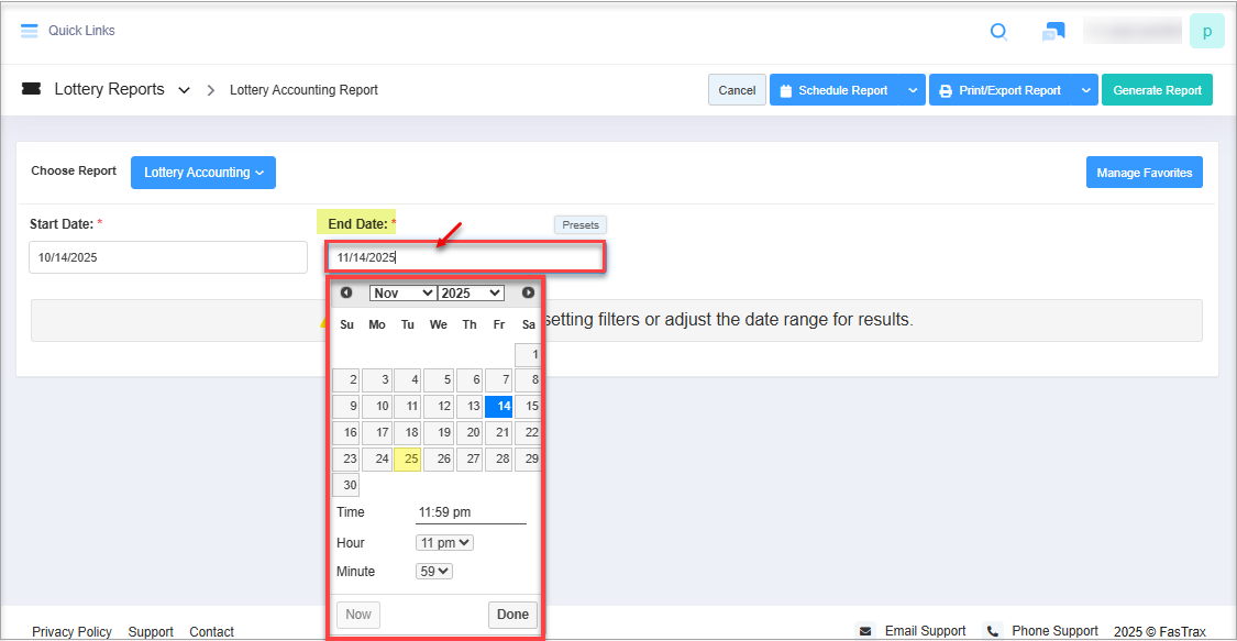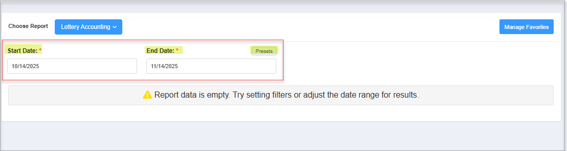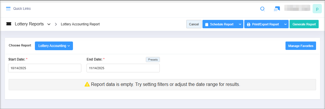 When you navigate to the "Lottery Accounting Report" page, you will see the current date selected by default. You can generate the report for the selected date range.