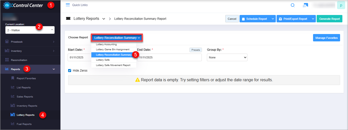 You will see the "Report Data is Empty" message initially. You need to select the date range to check the Lottery Reconciliation Summary Report in the report. See Figure 2.2.
