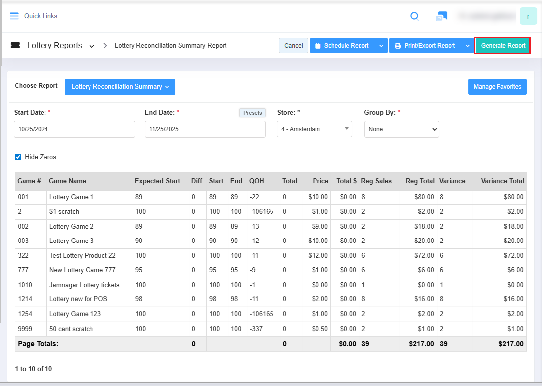 Lottery Reconciliation Summary Report Overview The "Lottery Reconciliation Summary Report" article provides a comprehensive overview of lottery activity across selected locations, based on the chosen filters and date range. It includes detailed ...