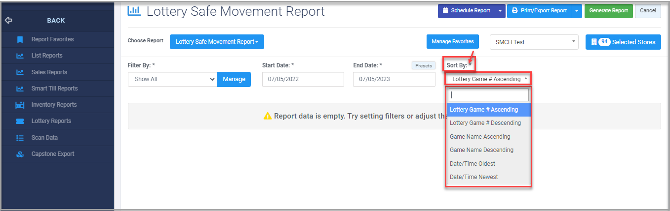 You will see the "Report Data is Empty" message initially. You need to select the filter options to check the Lottery Safe Movement Report. See Figure 2.1.