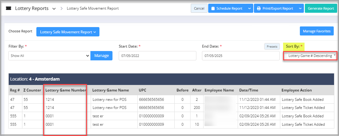 - Employee Action: The action that is performed by the employee on the lottery safe is specified in this column.