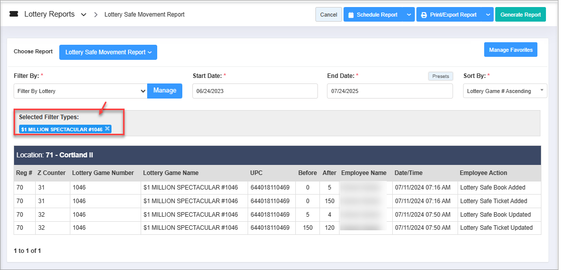 The Lottery Safe Movement Report provides detailed tracking of all lottery-related movements involving the store safe. It captures key information such as the register number, Z report number, lottery game name, product UPC, and the safe values before and after the transaction.