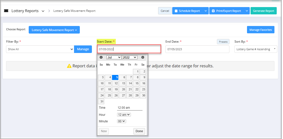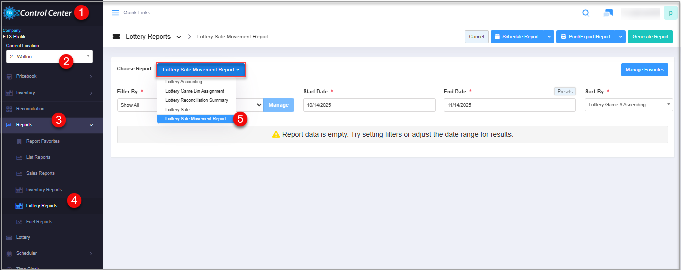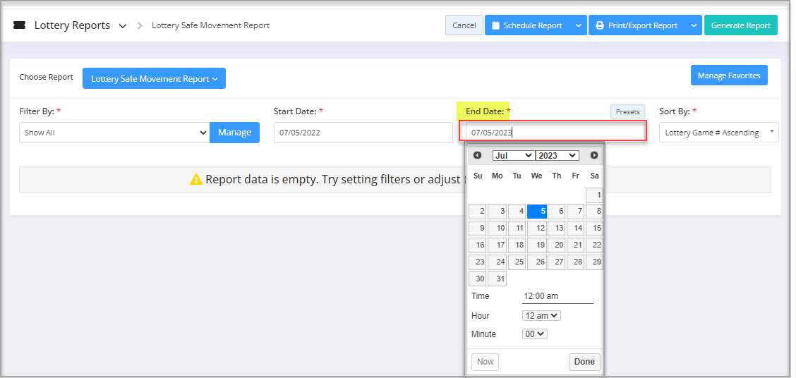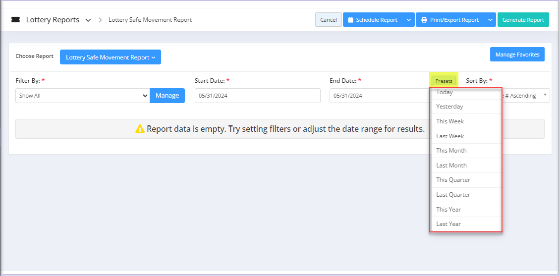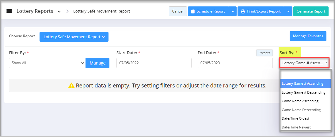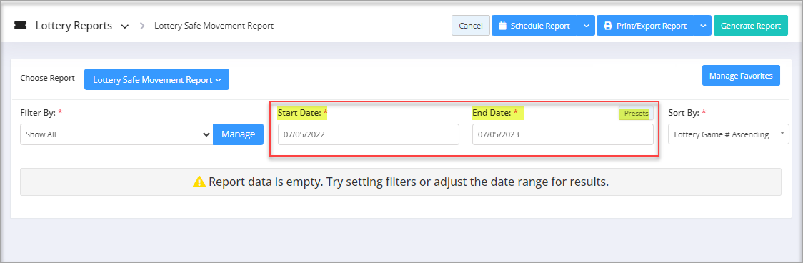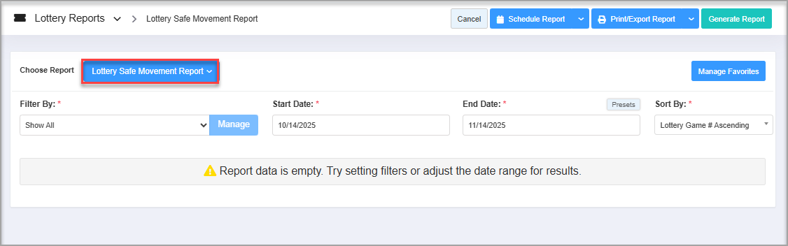 You will see the "Report Data is Empty" message initially. You need to select the filter options to check the Lottery Safe Movement Report. See Figure 2.1.