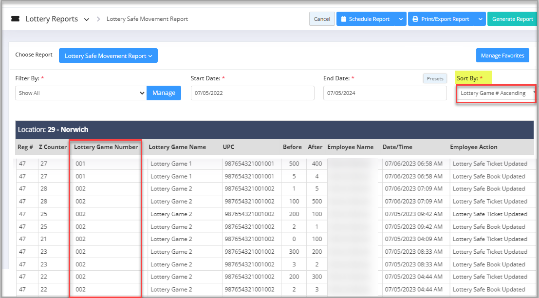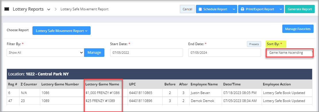 - Game Name Ascending: If this sorting option is chosen, the Lottery Safe Movement Report is sorted in ascending order of the lottery game name.