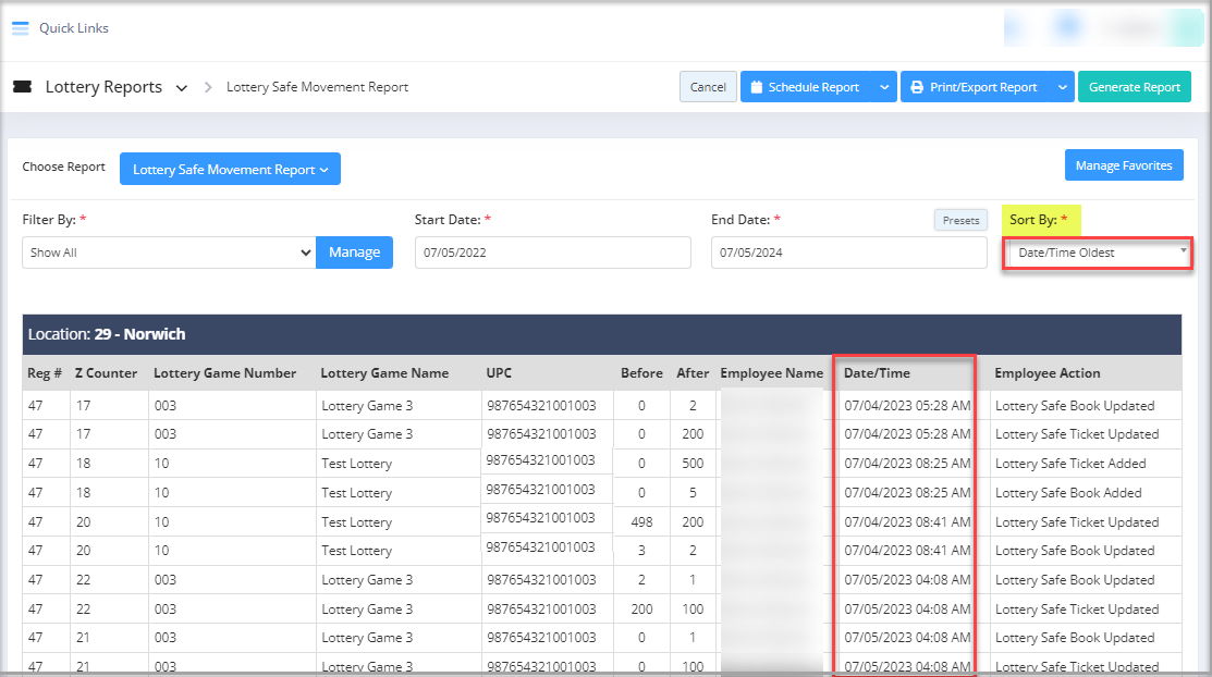 - Date/Time Oldest: If this sorting option is chosen, the Lottery Safe Movement Report is sorted in ascending order of the date/time.