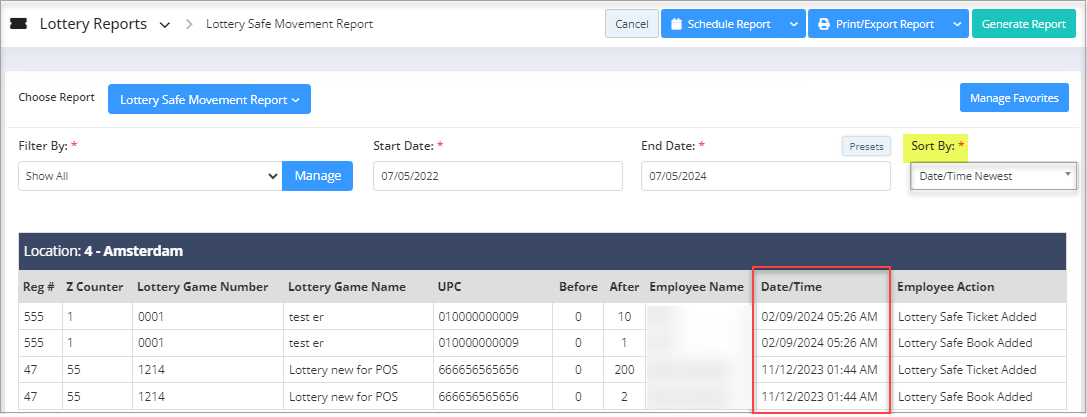 - Date/Time Newest: If this sorting option is chosen, the Lottery Safe Movement Report is sorted in descending order of the date/time.