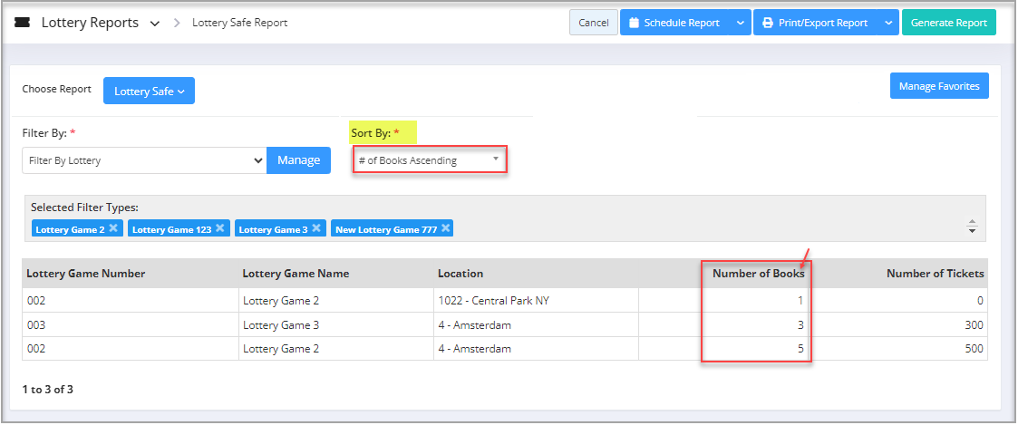 - # of Books Ascending: Each lottery book has a unique number in addition to the game number, so if this sorting option is chosen, the Lottery Safe Report is sorted in ascending order of the lottery ticket books.