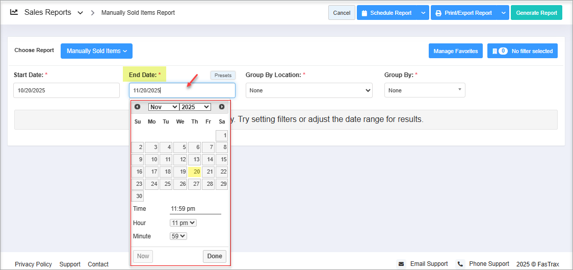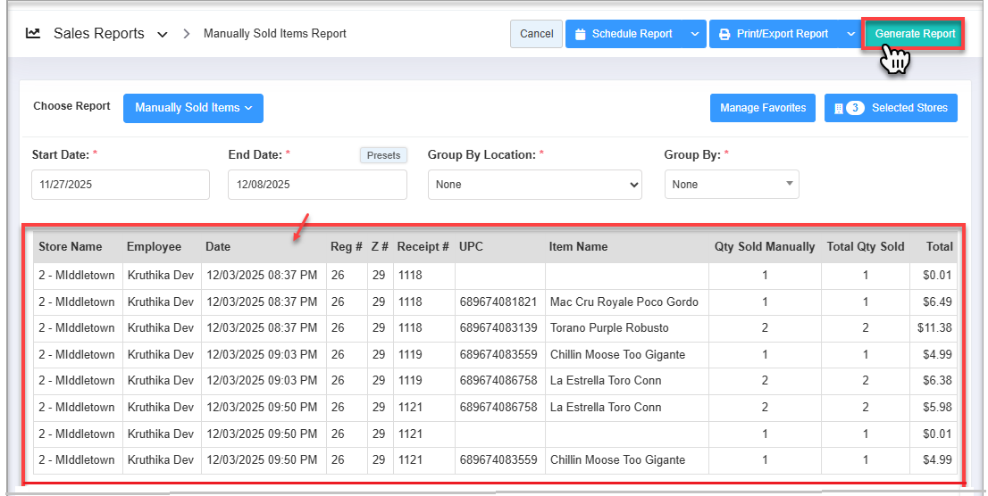 - Select the date range and click "Generate Report" to view the "Manually Sold Items Report" for the selected date range.