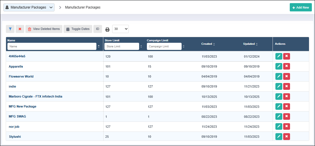When an Admin clicks on "Manufacturer Packages," a grid-based dashboard is displayed listing all configured manufacturer packages. This dashboard provides visibility into package limits, pricing, and lifecycle details.