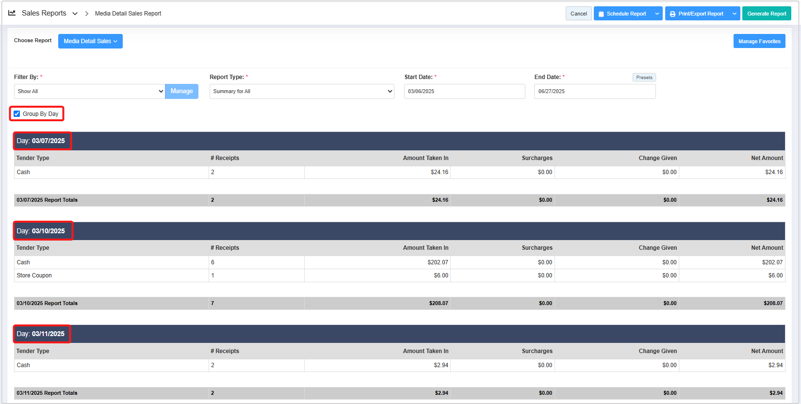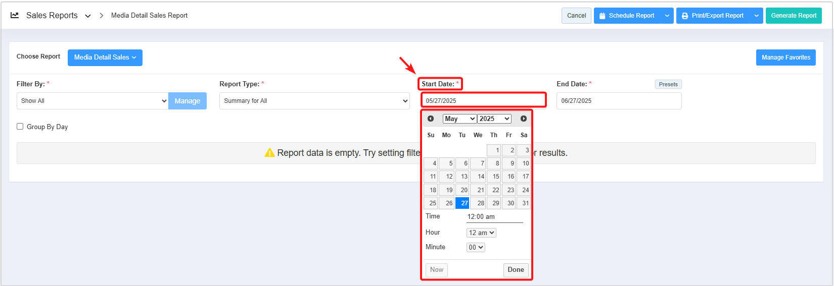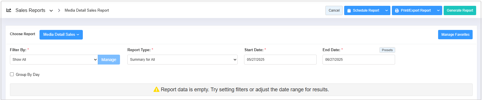 - Select the date range and click "Generate Report" to view the "Media Detail Sales Report" for the selected date range.