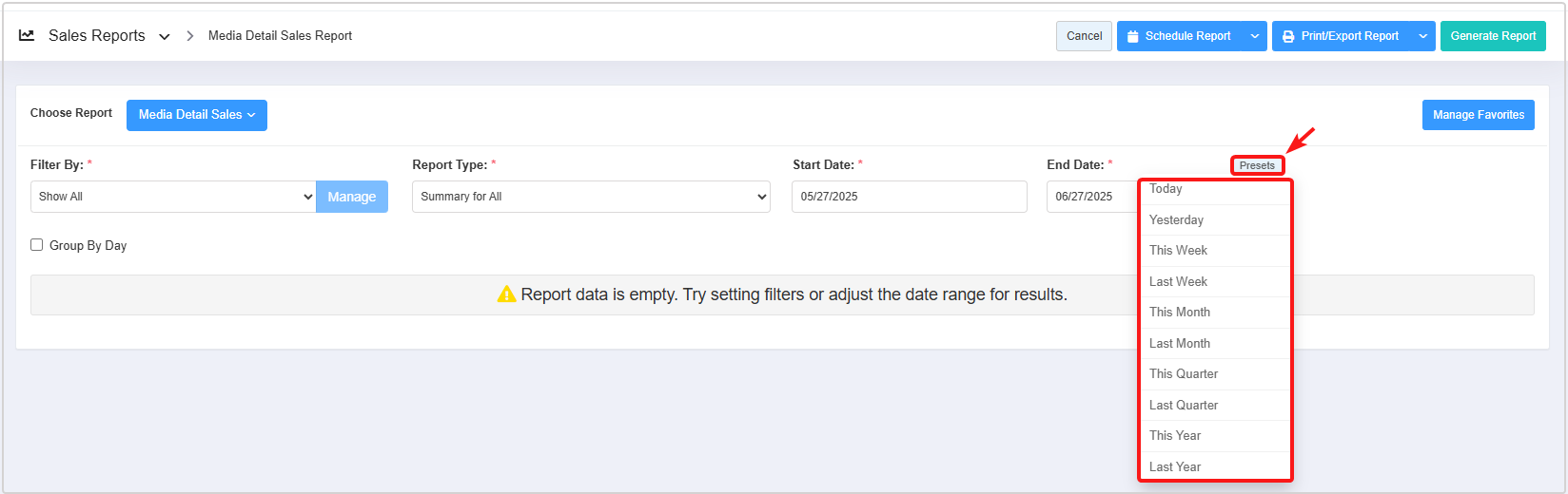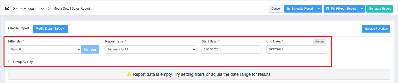 - How to generate the "Media Detail Sales Report" for the selected date range