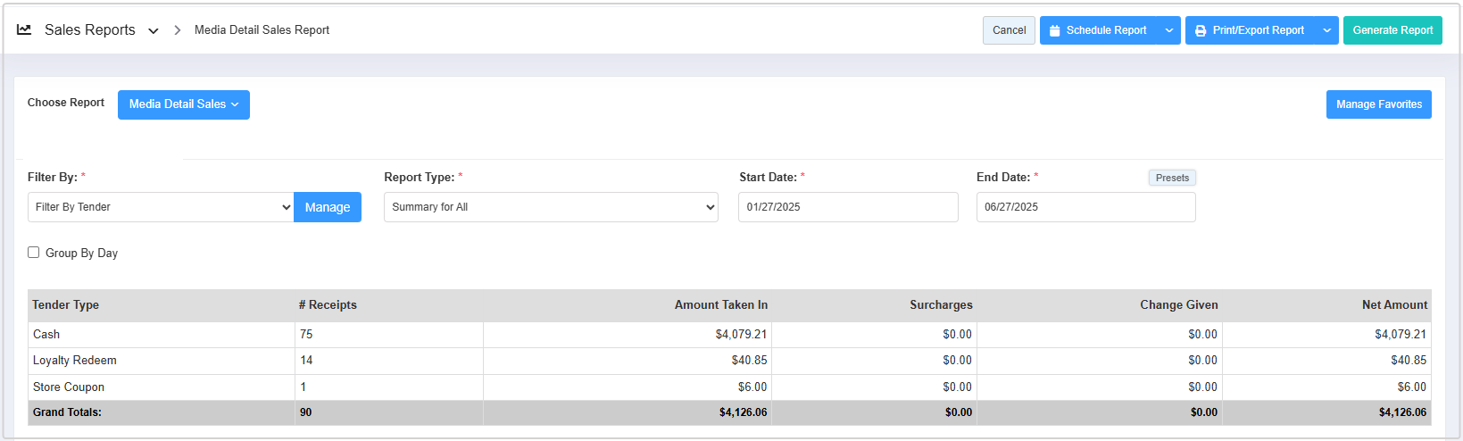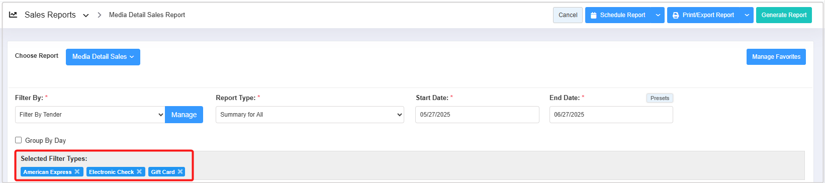 - Filter By: Filter By lets you view the report based on specific media or tender type, such as a specific credit card, cash, coupons, etc. 3.1 Filter By explains further details.