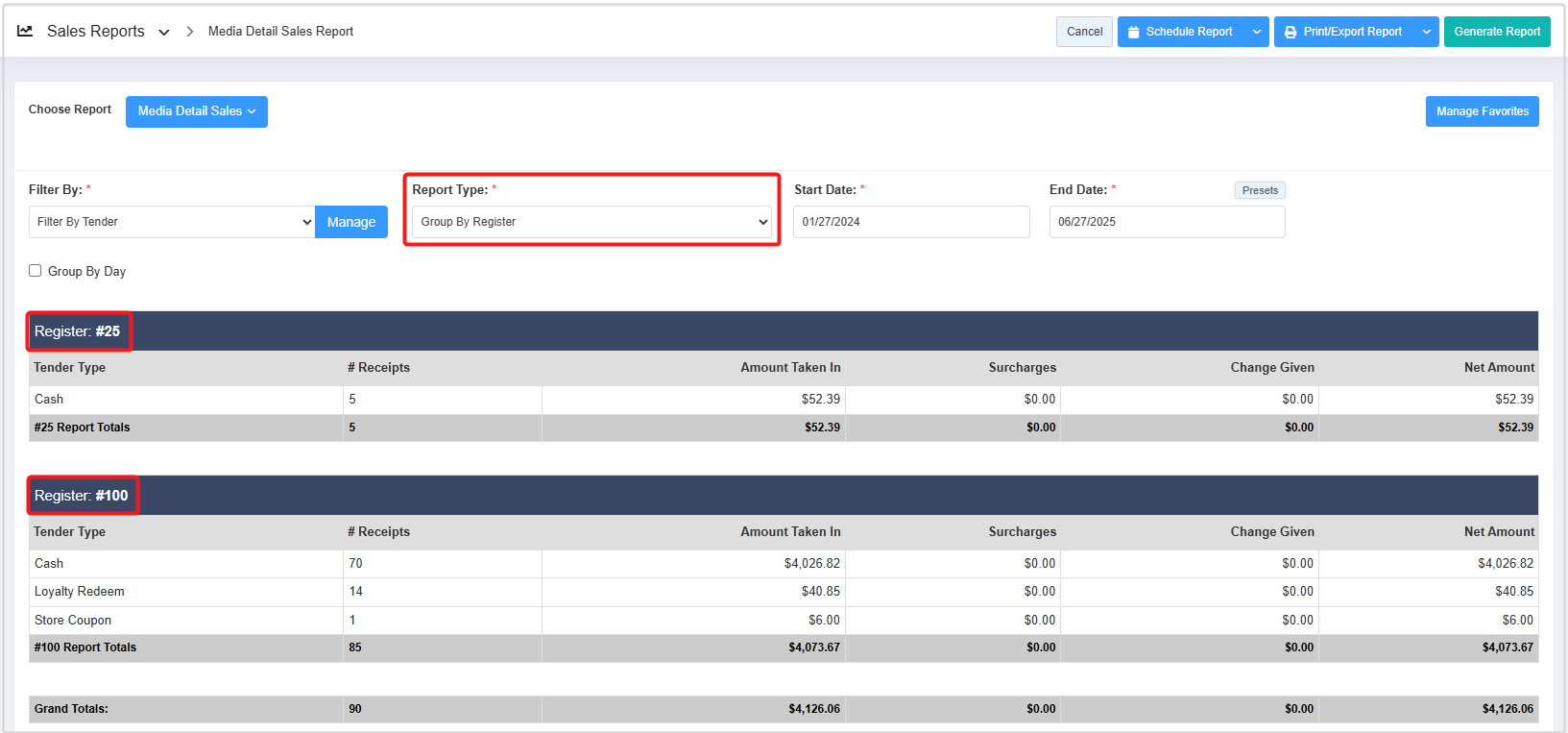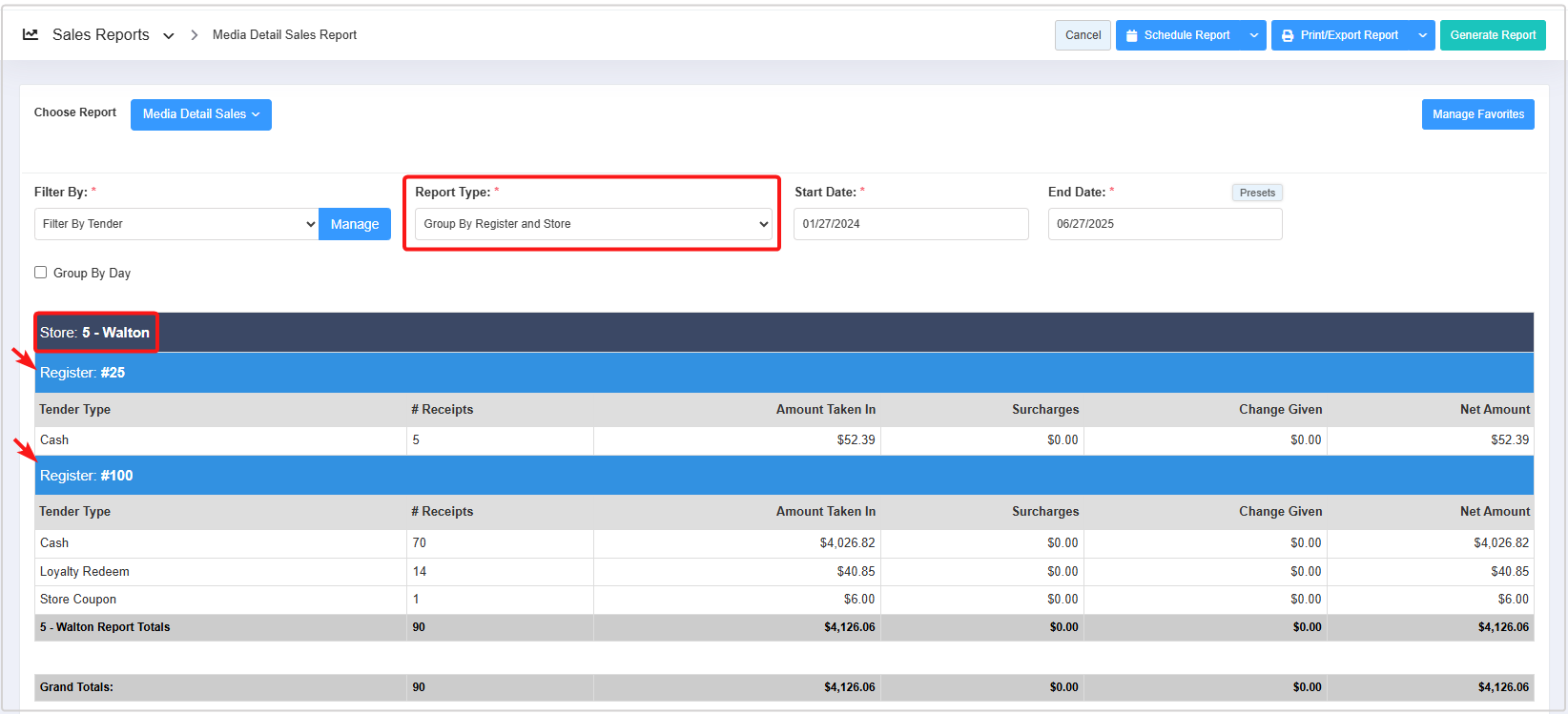- Report Type: The Report Type filter lets you generate five reports: Summary for All, Summary By Store, Group By Register, Group By Register and Store, and Group and Details for All. 3.2 Report Type explains further details.