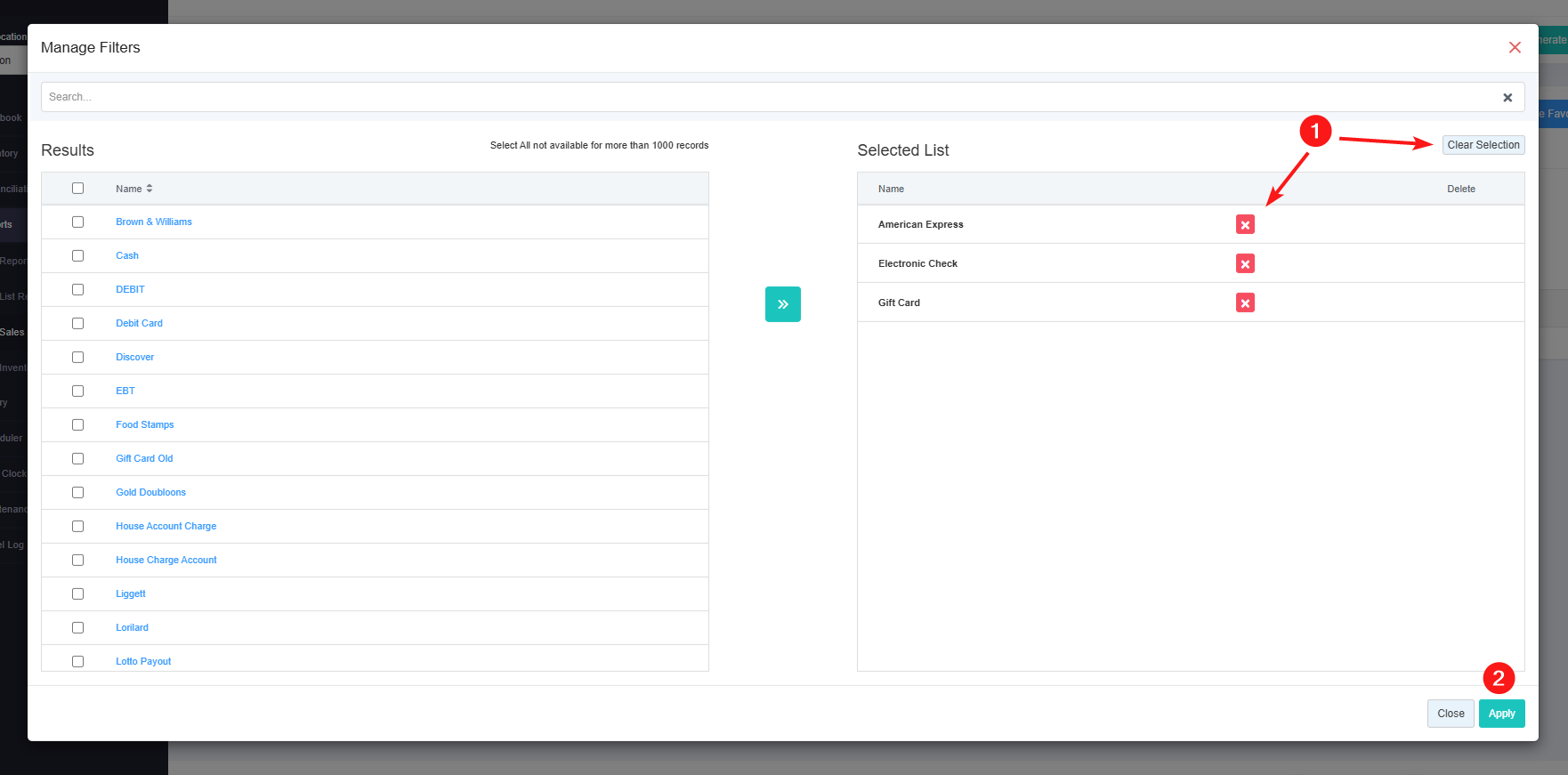 - 1: Clear Selection: Click the "Clear Selection" button to remove the whole selection. To remove any record from the list, click the Remove (x) icon.