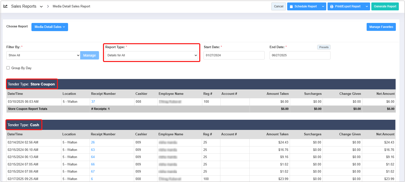 - Change Given: This column displays the change given back to the customer, which is usually relevant when the tender type is cash.