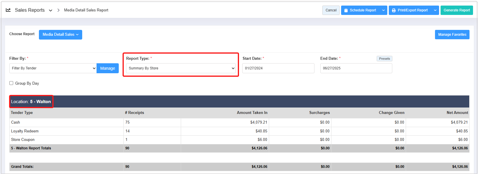 - Summary By Store: The "Summary By Store" option organizes the report records by store. It is a valuable option for corporate employees. As a store employee, selecting this option will display the store's name in the header that you chose from the left panel.