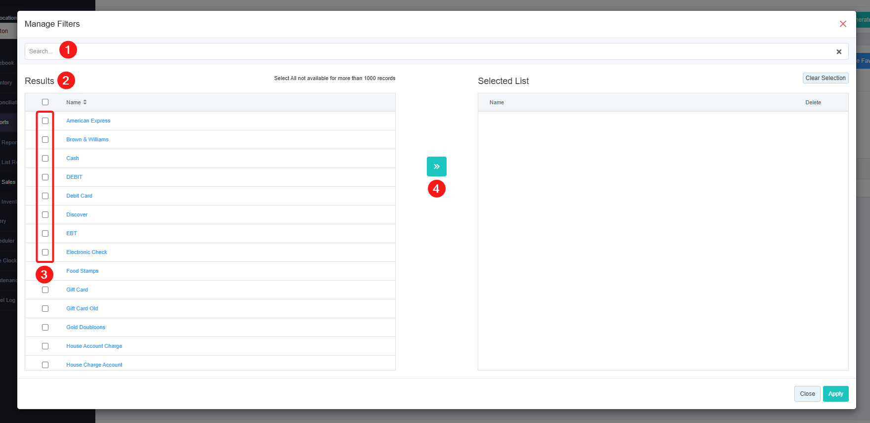 - 4: Arrow: Click the green Arrow button to move the selected records to the Selected Area.