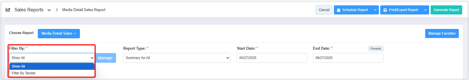 The Filter By drop-down lets you select the report data using specific customers. It has two selection options: Show All and Filter By Tender.