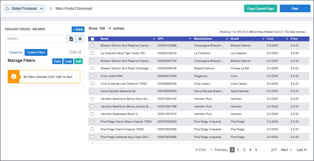 This section displays all global products from the Product Global Database that are relevant to the selected industry. It provides a convenient reference for selecting and cloning products into your account. Once a product is cloned into your store’s pricebook, its details can be edited later as needed. All industry-specific products are listed here with comprehensive details for each item, including:
