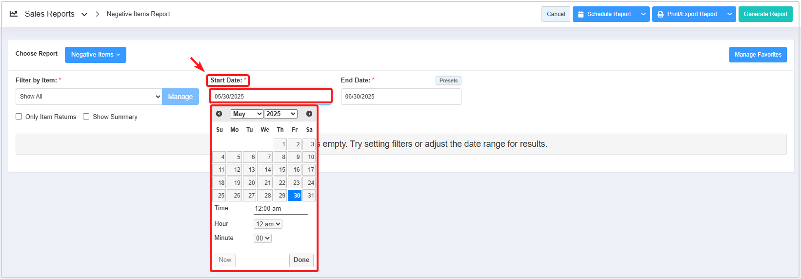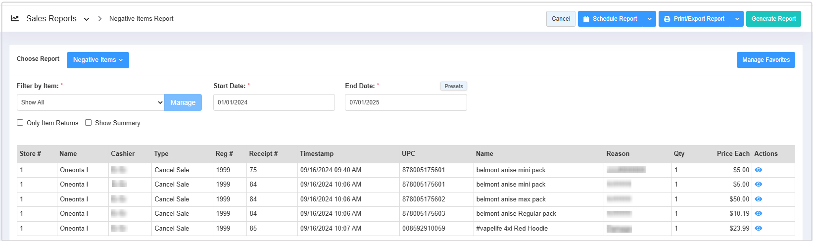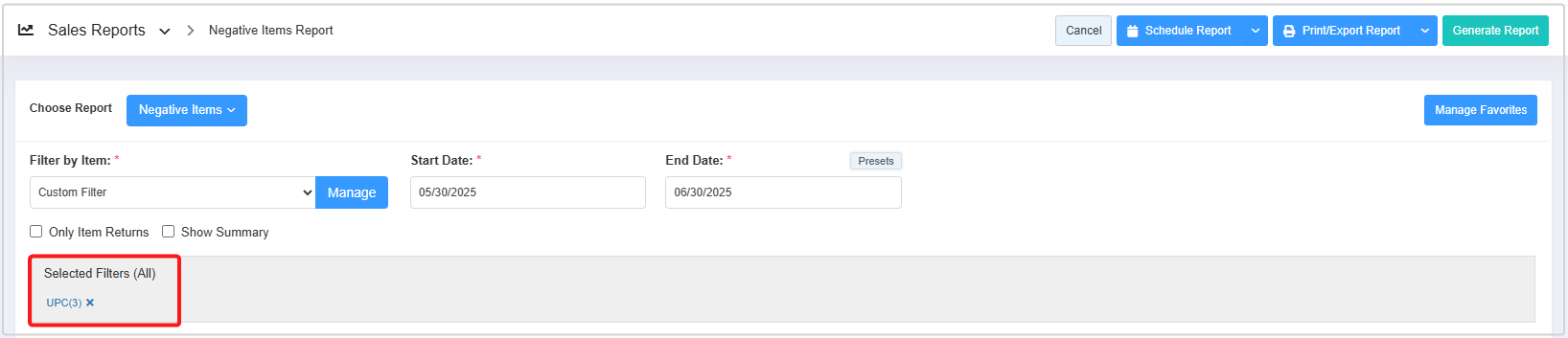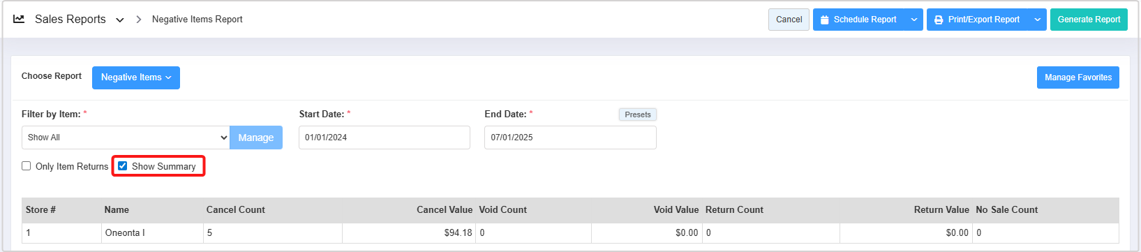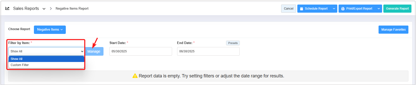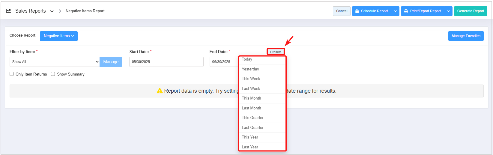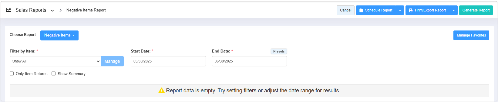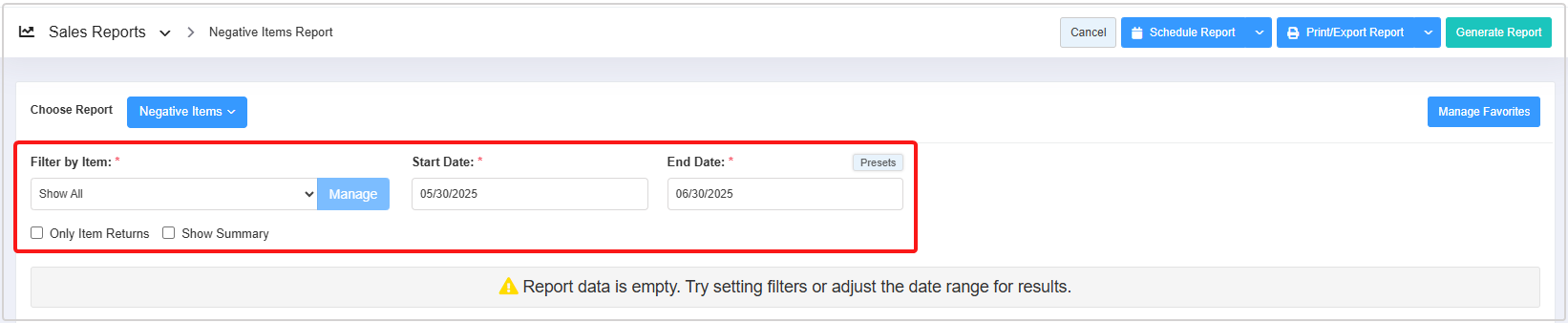 - Select the date range and click "Generate Report" to view the "Negative Items Report" for the selected date range.
