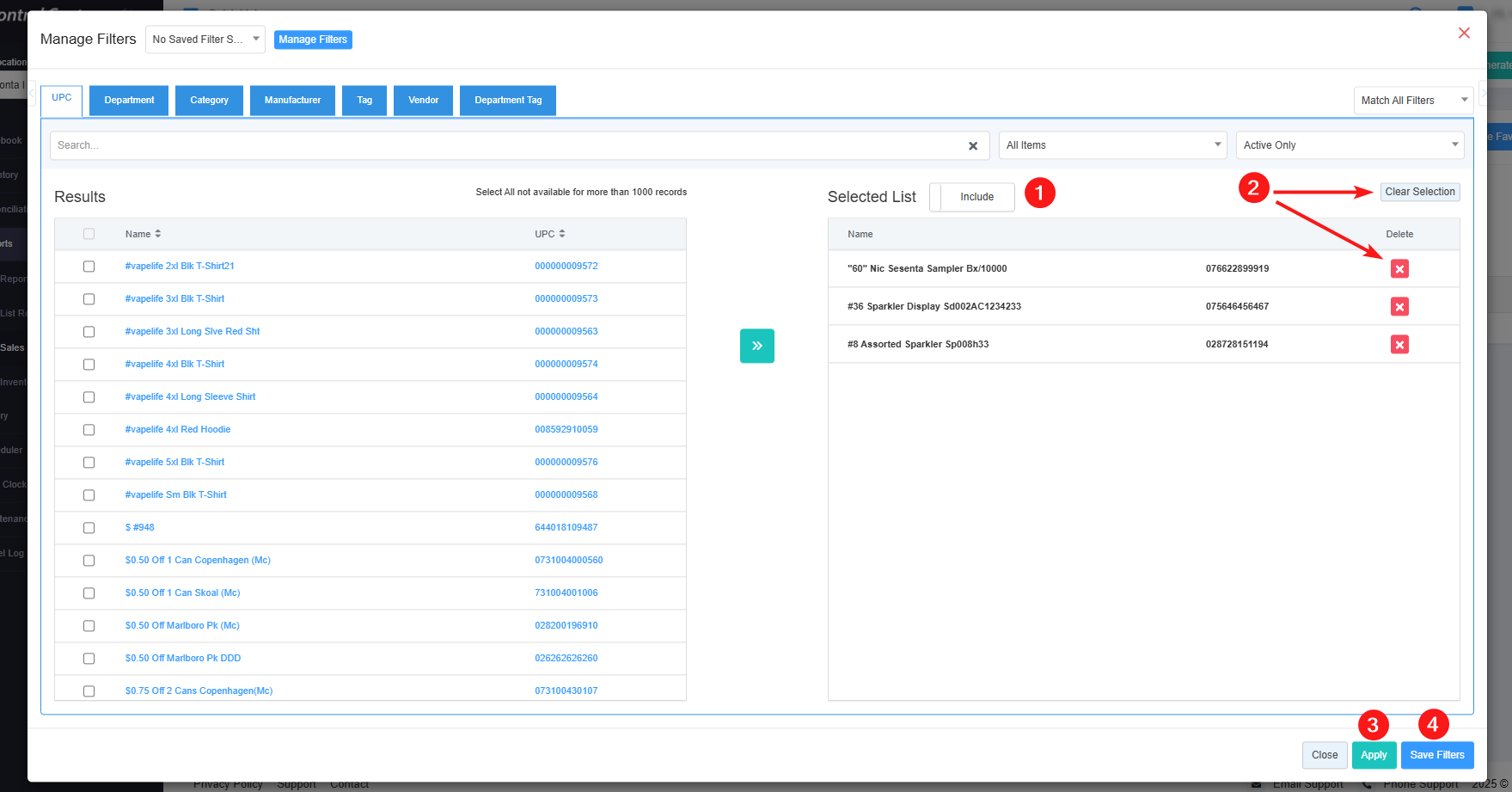 - 6: Active Only: Use this filter to filter the Manage Filters screen data based on three product parameters: Active Only, Inactive Only, and All Records. This filter is available only for the "UPC" tab.