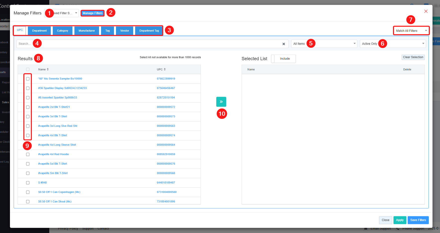 - 7: Match All Filters Drop-Down: The Match All Filters filter has two options, "Match All Filters" and "Match Any Filters." Select either option to determine whether the Manage Filter screen data matches all applied filters. This drop-down is particularly useful when you use multiple parameter tabs, such as when you choose a few UPCs from the "UPC" tab and a few vendors from the "Vendor" tab.