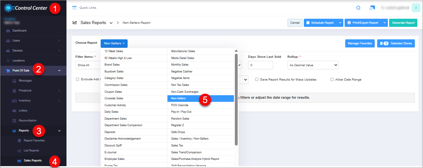 The "Non-Sellers Report" lists items not sold during the selected date range. It will