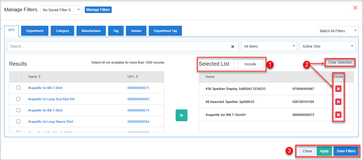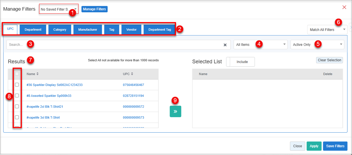 2. Parameter Tabs: Here, you will see six tabs: UPC, Department, Category, Manufacturer, Tag, and Department Tag. Select the required tab, i.e., "UPC," to create or apply a custom filter specific to the selected UPCs.