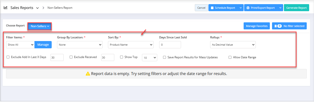 - None: If any location is not selected, it will display the report for non-sellers items for every location by default. See Figure 3.1.