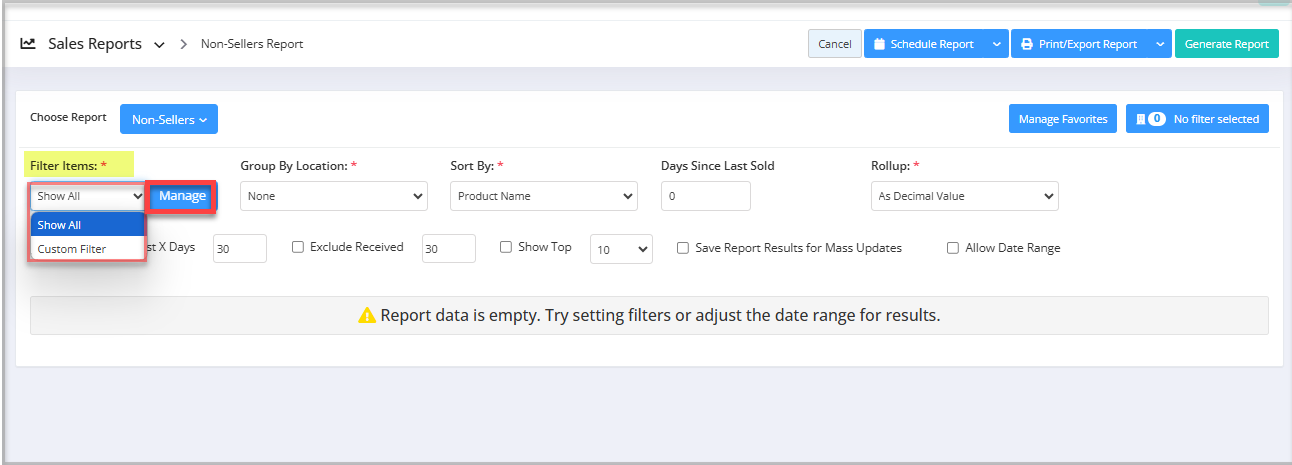 The system will redirect you to the Non-Sellers Report home screen. Click "Generate Report" to generate the report for the selected filter. Clicking the "Manage Filters" button will also open the list of saved custom filters.