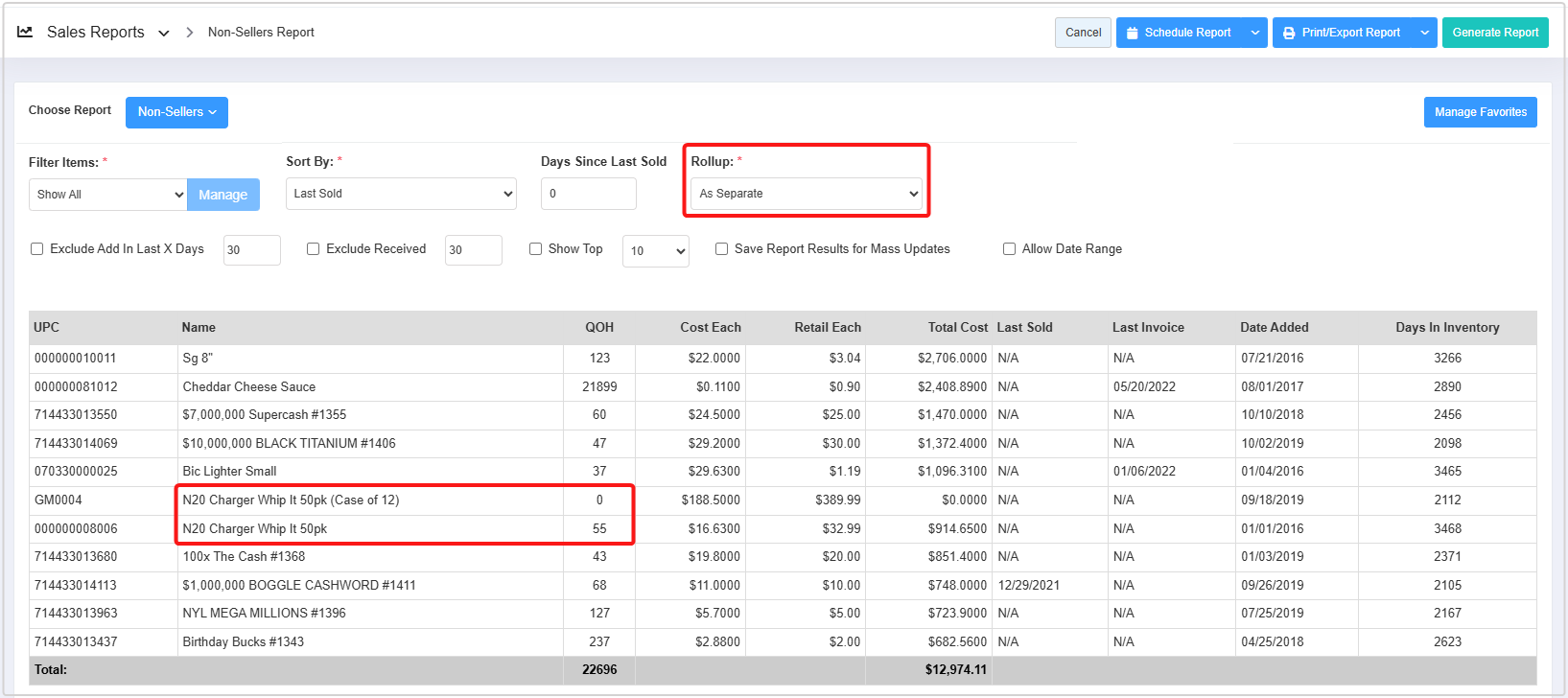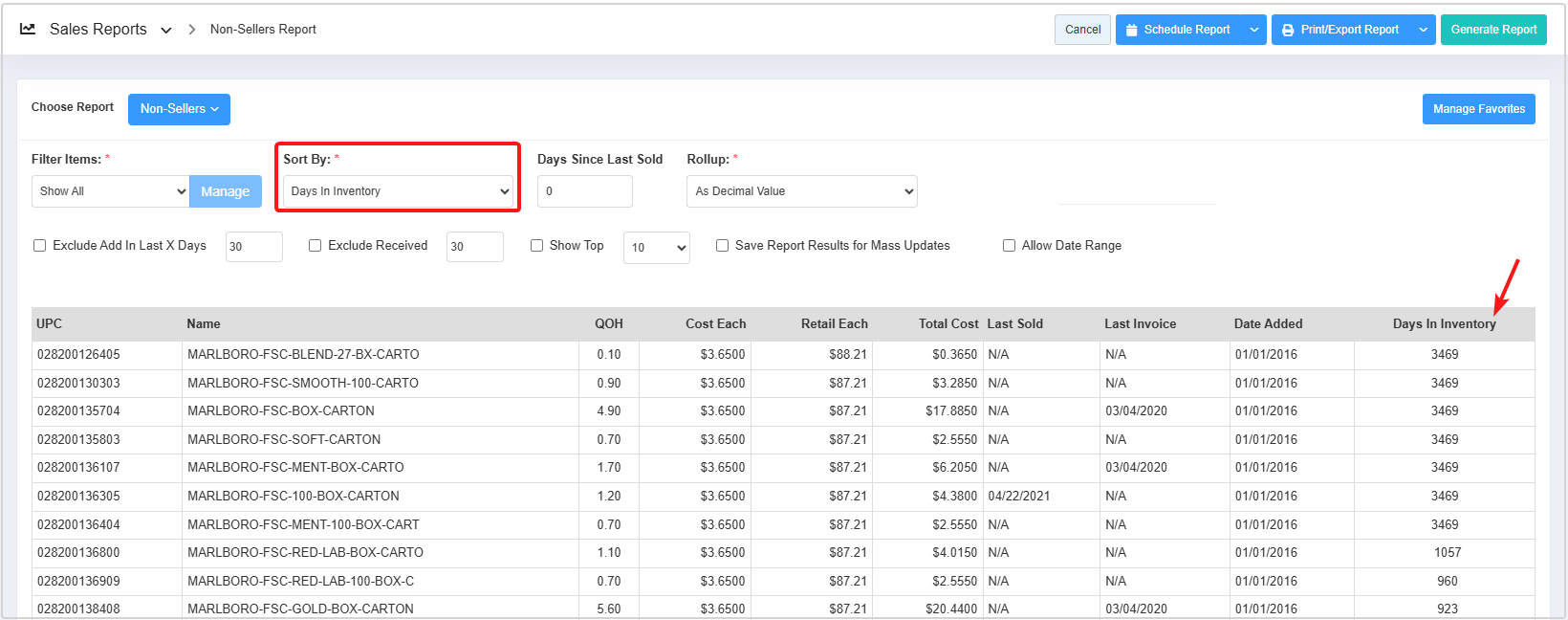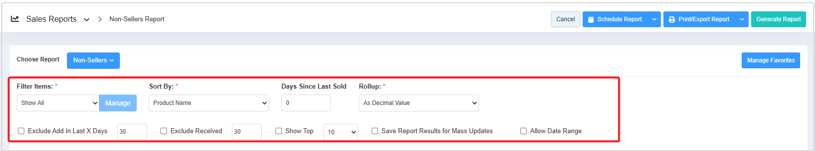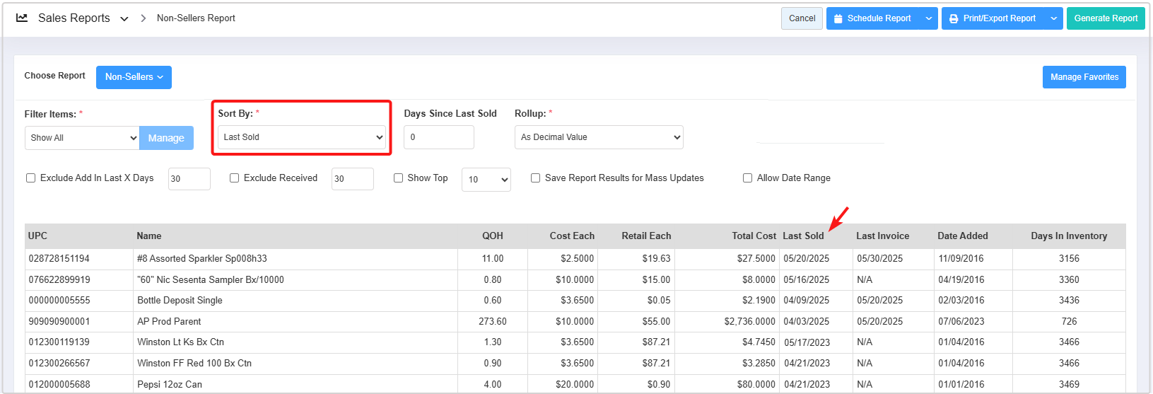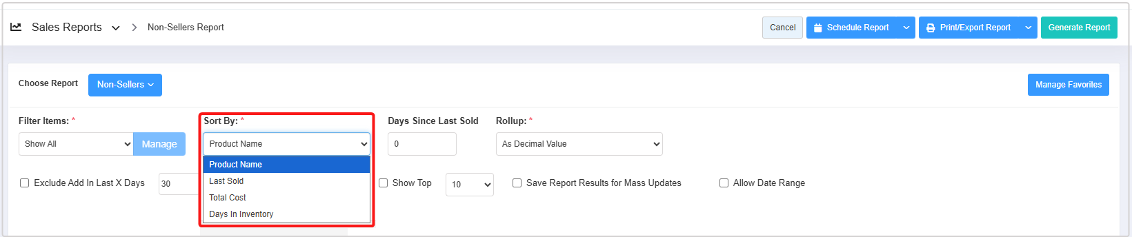 - You can use the Filter Items (Custom Filters), Sort By, Days Since Last Sold, and Rollup filters and Exclude Add In Last X Days, Exclude Received, Show Top, Save Report Results for Mass Updates, and Allow Date Range checkbox filters to create the report that meets your requirements. You can use multiple filters to make the report more specific. Please refer to point 3. Report Filter Options, to learn more about these filters.
