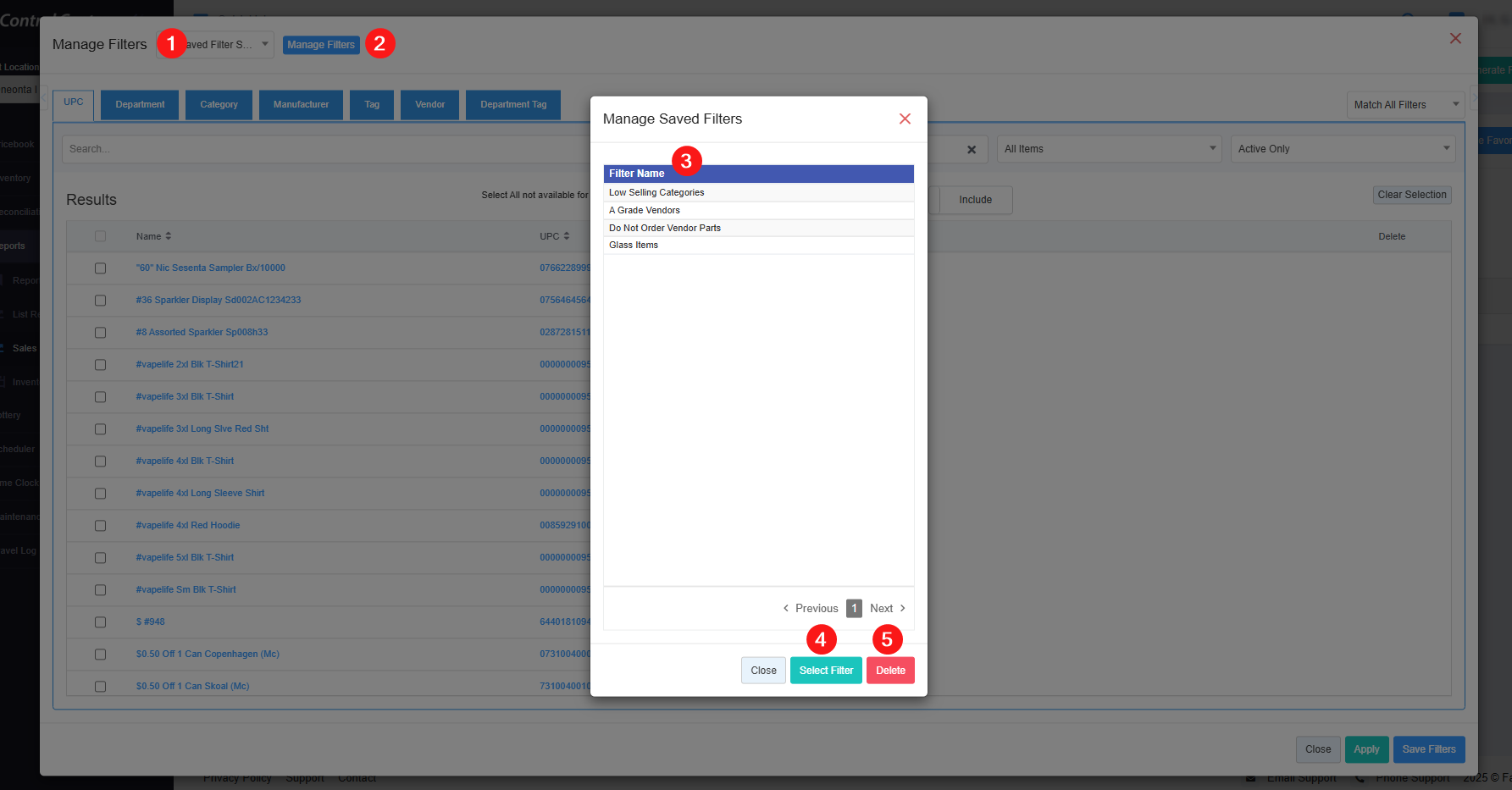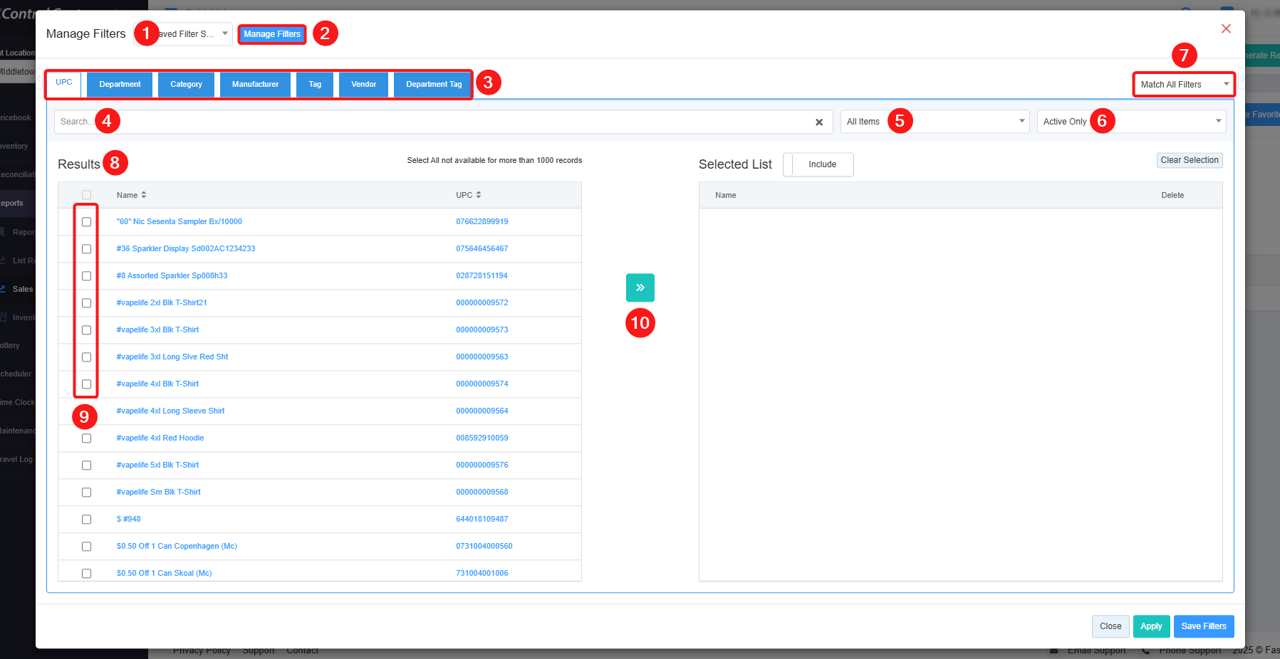 - 8: Results: Here, you see the relevant list of data on the Manage Filter screen for the selected tab. For example, if you have chosen the "UPC" tab, it will show the list of all UPCs. You can use the "Search" bar for a specific UPC. You will see the data accordingly if you have applied the 4, 5, 6, or 7 filters.