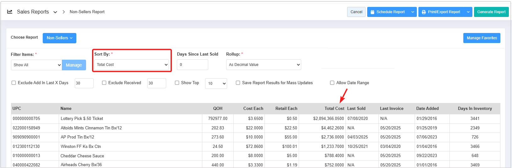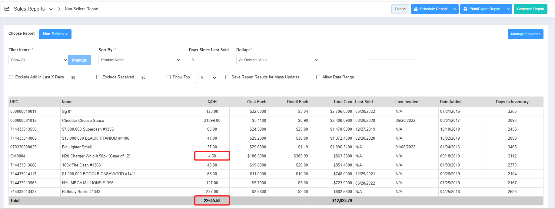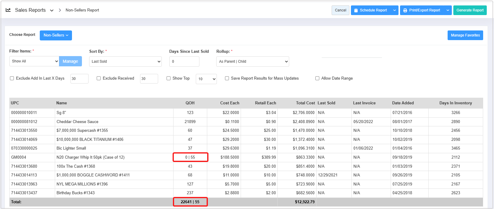 - Total Cost: The total cost of the non-selling product. (Total Cost = Cost Each * QOH)