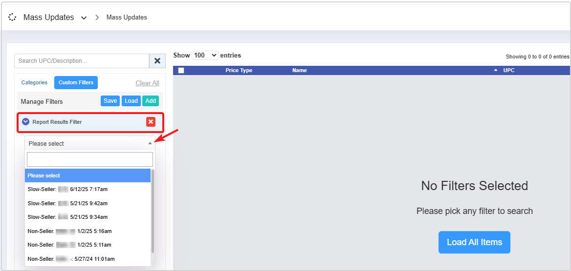 - When you tick this checkbox and generate the report, the system will save the generated report as a "Mass Updates" filter that you can use when loading items to perform the mass update actions. However, it will not affect the report you are generating.