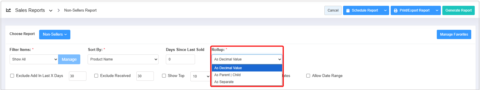 The Rollup filter lets you combine the sales quantity of the products' parent and child quantities in the report based on three options: As Decimal Value, As Parent | Child, and As Separate.