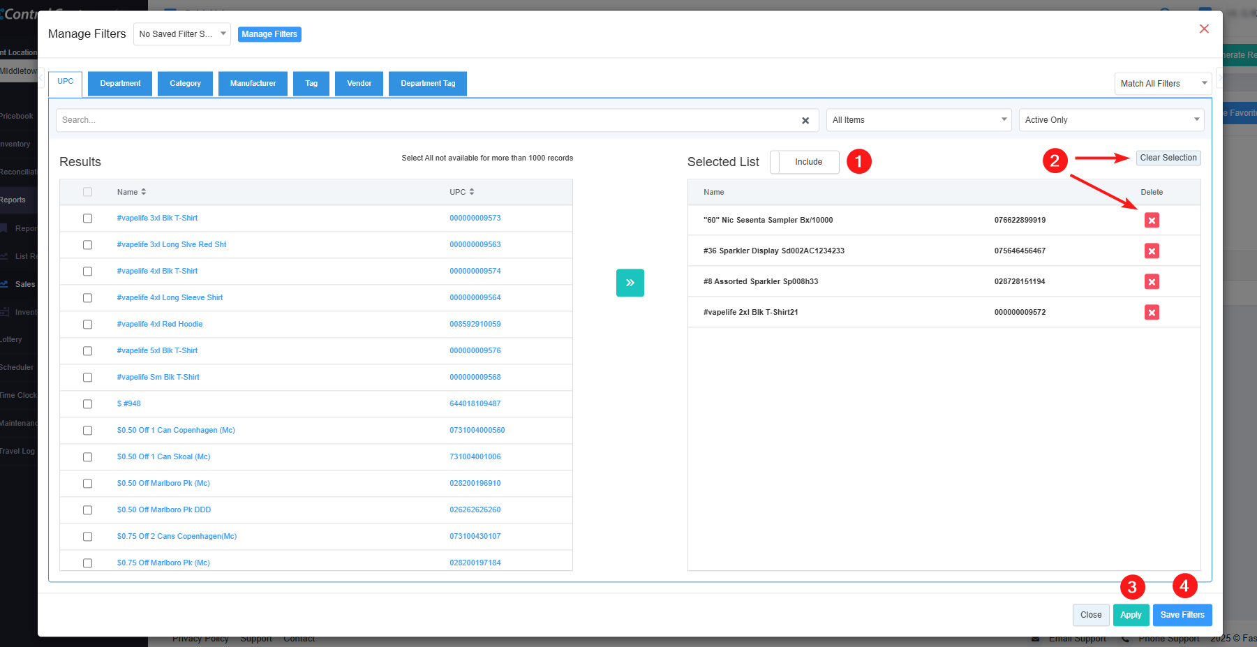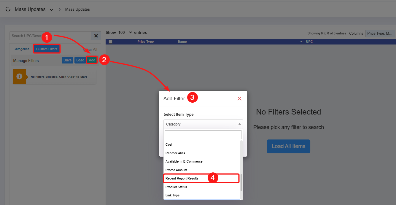 - Filter Items (Custom Filters): The Filter Items filter lets you select the report data based on seven parameters: UPC, Department, Category, Manufacturer, Tag, Vendor, and Department Tag. 3.1 Filter Items (Custom Filters) explains the further details.