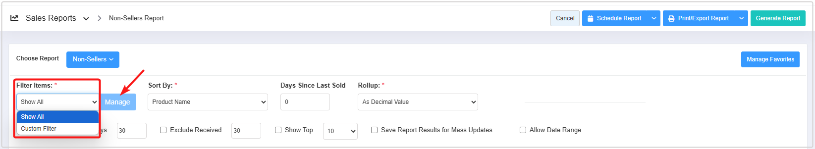 - 1: Saved Filters Drop-Down: Select the saved custom filters from the Manage Filters drop-down (if any) and click "Apply" to apply the saved custom filter. The system will redirect you to the home screen for the Non-Sellers Report. Click "Generate Report" to generate the report for the selected filter.