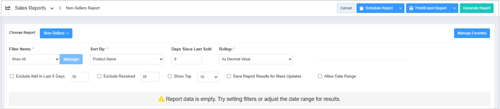 When you click "Non-Sellers Report," the Non-Sellers Report screen will open. As shown in Figure 1.2, it provides relevant filtering and sorting options.