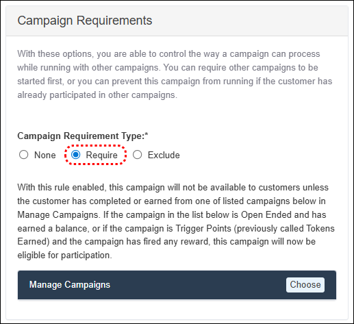 - Require: When this rule is activated, the campaign will only be accessible to customers who have either completed or earned rewards from one of the campaigns listed in the Manage Campaigns section. For instance, if the campaign listed below is Open Ended and the customer has accumulated any balance, or if the campaign listed below is a Trigger Points campaign and the customer has received any rewards from it, then the customer will become eligible to participate in this new campaign. This ensures that only those customers who have engaged with certain previous campaigns can join this one, creating a tiered or progressive campaign structure.